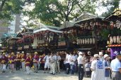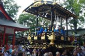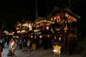 舞台は24日早朝曳き出されて各町に置かれます。そして深志神社で宵祭りが斎行される夕刻、お囃子の音とともに境内に曳き込まれ十六台が社前に並びます。この懐かしい祭り姿は、いつまでも続けていきたい昔ながらの松本の風物詩です。