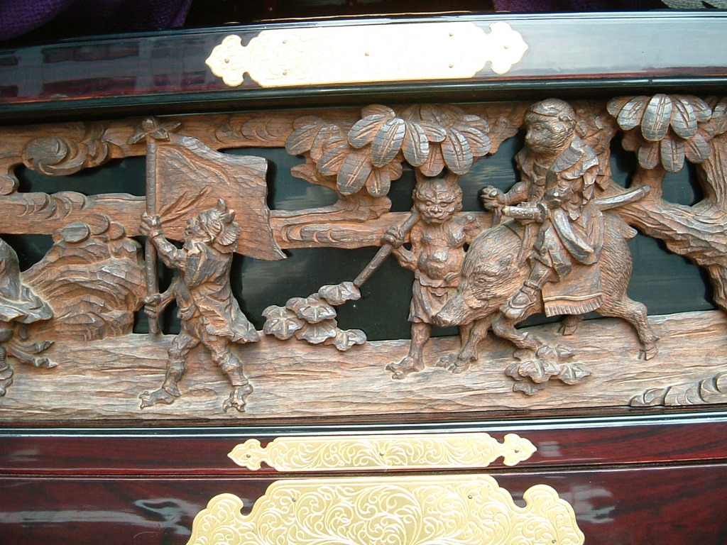 また、一階の手摺には「桃太郎一代記」、童話・桃太郎の主要場面が彫られています。
