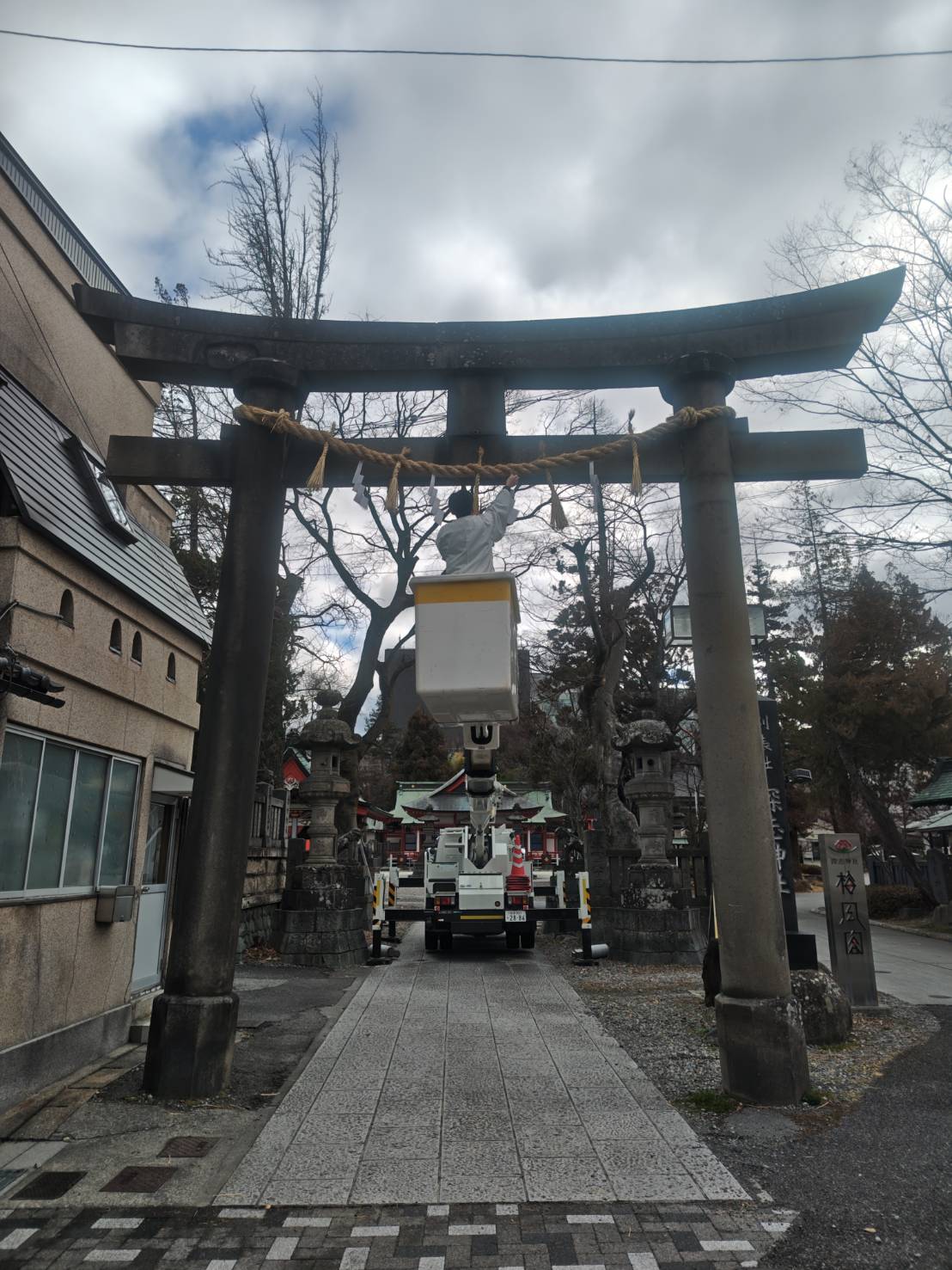 張り替えにあたっては高所作業車を使い、一番大きな石鳥居など約15か所の注連縄と紙垂を取り替えました。