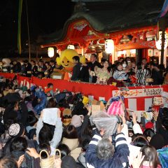 太鼓の合図をもって豆まきが開始されます。拝殿と天神会館の2ヶ所から「鬼は外、福は内」の声とともに福枡に入った炒り豆・餅・みかん・福銭・お菓子・当たり券等がまかれます。特設ステージ横には小学生以下の子ども専用コーナーもございます。