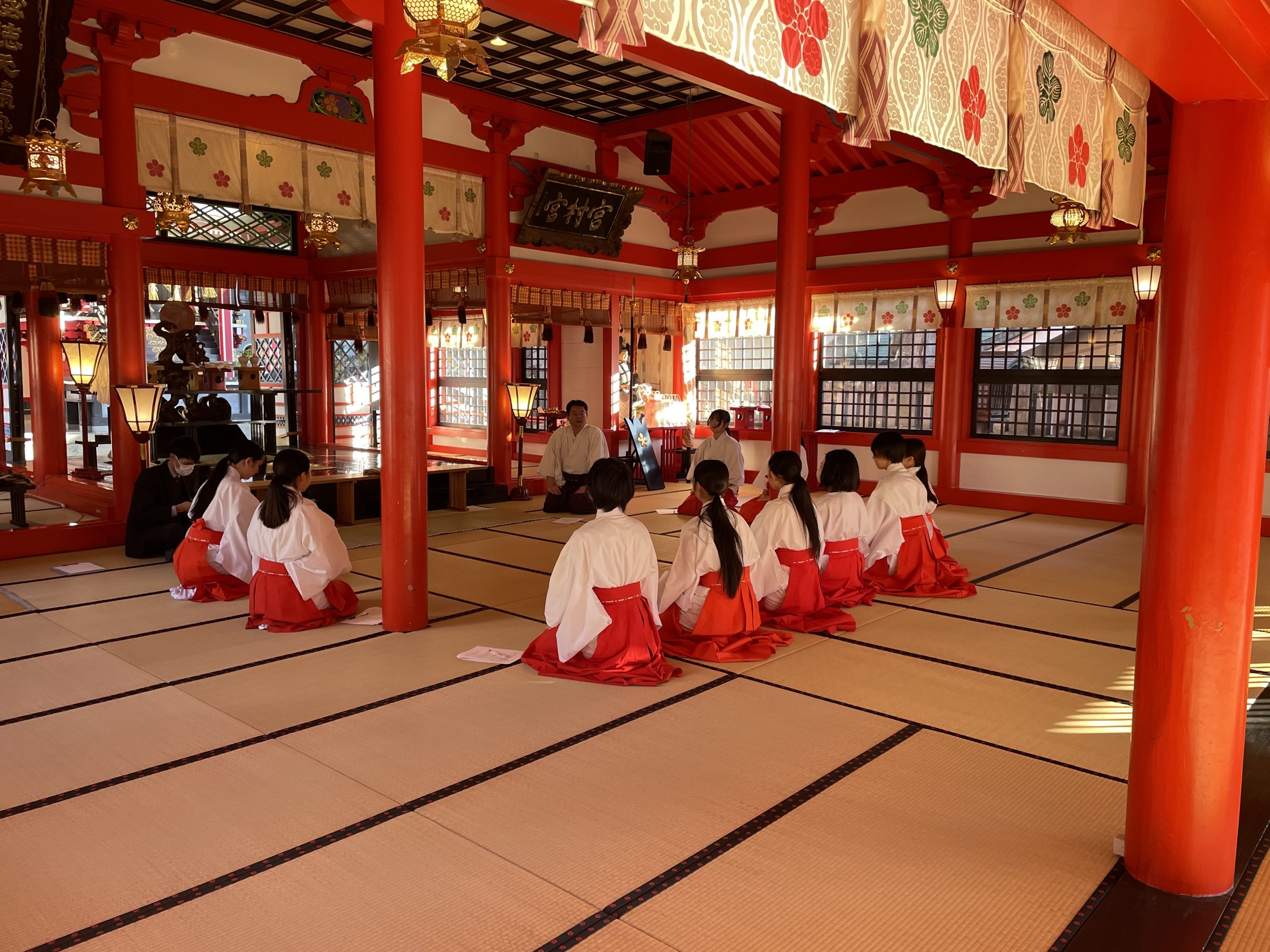 本年は近隣の高校生を中心に15名が参加し、参拝者の皆様に清々しいお気持ちでお参りしていただけるよう装束の着方をはじめ、巫女として相応しい言葉遣いや礼儀作法を学んでいただきました。